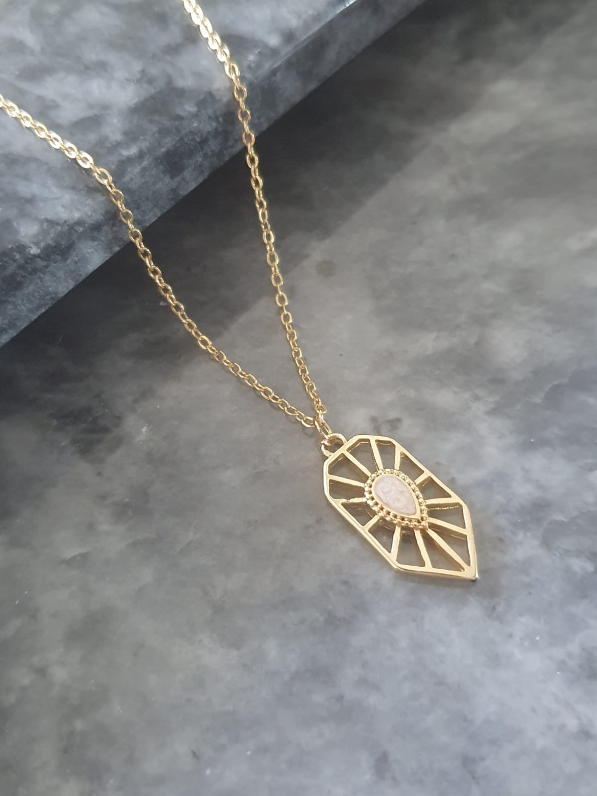 Malzeme: Gold renk lak kaplama Model: Geometrik çerçeve + damla detaylı orta taş Zincir Uzunluğu: 45 cm Ek Zincir: 5 cm Ağırlık: Çok hafif ve konforlu kullanım Kaplama: Kararmayı geciktiren...